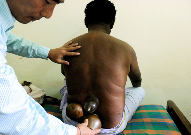 Next, the intern firmly pressed it against the patients back until the cup suctioned and allowed it to sit there for ten to fifteen minutes. This is said to loosen the muscles and relieve the pain. This procedure is very common especially among the elderly and middle aged Tibetans.